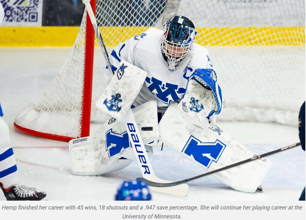 Hemp has been a mainstay in goal for the Skippers for the past three seasons and this year won 16 games and posted a 0.92 goals against average and a .951 save percentage. In her career she has a 44-5-1 record with 18 shutouts and a .947 save percentage. She was also the starting goalie for the Team USA U18 squad who won a gold medal. She will play college hockey at the University of Minnesota.